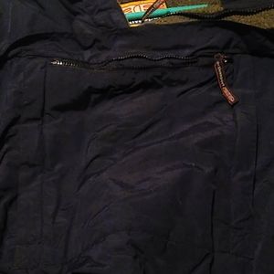Blue red with pocket in front hood that rolls up to hide pull over