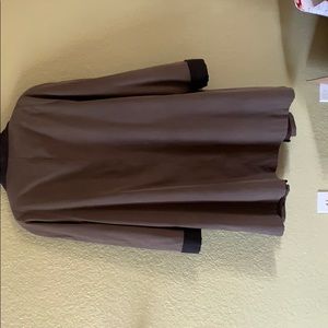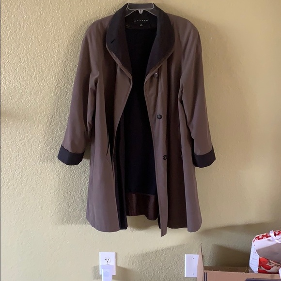 Dark drown coat with black inner lining. Removable liner. Goes to mid thigh. It’s super warm and good quality. Runs a bit big