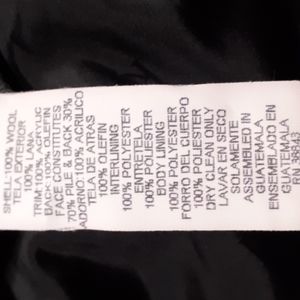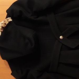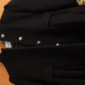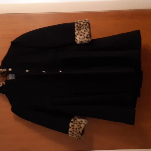 This coat has fur around the wrist and the hood has fur in it to. It buttons up the front and has a decorative button on the back. It also has pleats down the front.