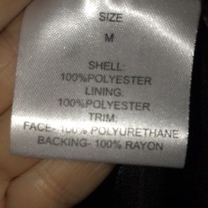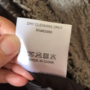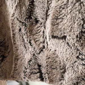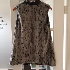 Coat/vest, Size M, faux fur, Never worn, but does not have tags, inside is lined, two pockets, lapel is faux leather, Color is grayish with a touch of brownish. There’s one hook closure in front right below the leather lapel, it’s where I’m holding, but you can’t see the hook