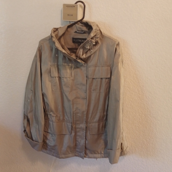 vut zip up light weight coat with a draw string middle , it's gold and a size large