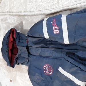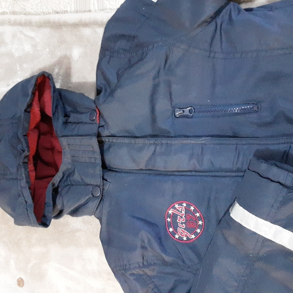 keep them warm with this artic style coat. full zip with velcro cover. Duel lower pockets. one breast zip pocket. reflecting straps for safety. removable hood. embroidered girls 97 . Used with 9-10 condition ( B # 24 )