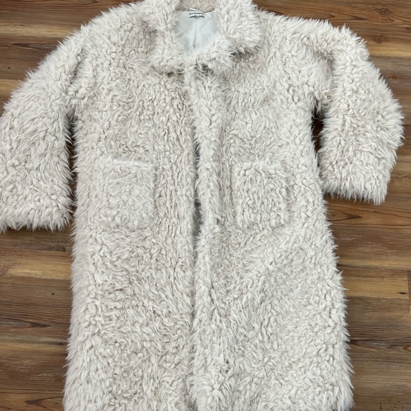 Practically new, worn two-three times. Excellent condition mid length fuzzy coat. Upscale boutique purchase.