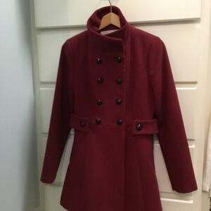 Beautifully line double breasted belted coat. Maroon / Red wine color. This is a juniors’ sized medium. The collar may be worn open or notched together for various looks. Has a belted waist and bottom flares a bit giving it a real feminine detail.