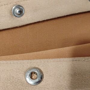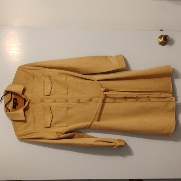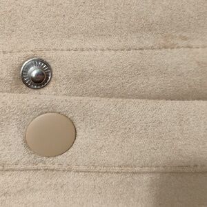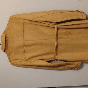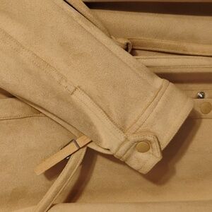 Suede-like faux leather light brown knee length coat. Light for cooler weather but not for real cold temps! Snaps up front.