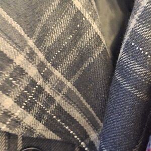 Two new plaid coats. One is red, gray, black with a white thead woven through. Tag is still on. Second is Black, gray, tan, tag removed.