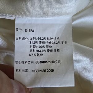 Fabric composition: fabric: 46.2% viscose fiber, 31.5% polyester fiber, 22.3% wool, wool collar: 100% wax fiber, lining: 93.9% polyester fiber, 6.1% spandex.