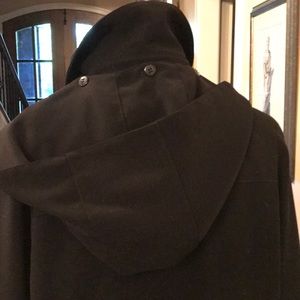 Black trench coat. Button off hood. Inside button in heavy insert not in- poly. Nice detailing