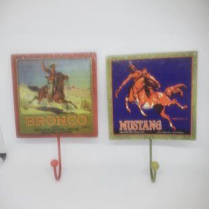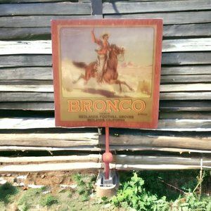 Bronco Brand Packed by Redlands Foothill Groves Fruit Box Label - on Green Metal plate and Hook. Measures 5 1/2 Square not including the 2 1/2" Hook.