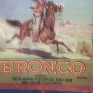 This shipping crate label was used by Bronco brand fruit that was packed by the Redlands Foothill Groves of Redlands, California during the early 20th century. The lithographed label has an image of a cowboy twirling a lasso riding a galloping horse across a desert plain.
