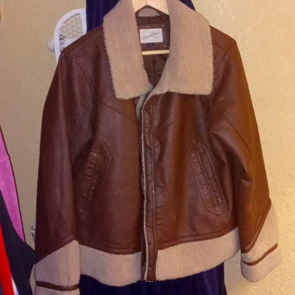 brown leather and fleece winter jacket with the zipper and pockets size large