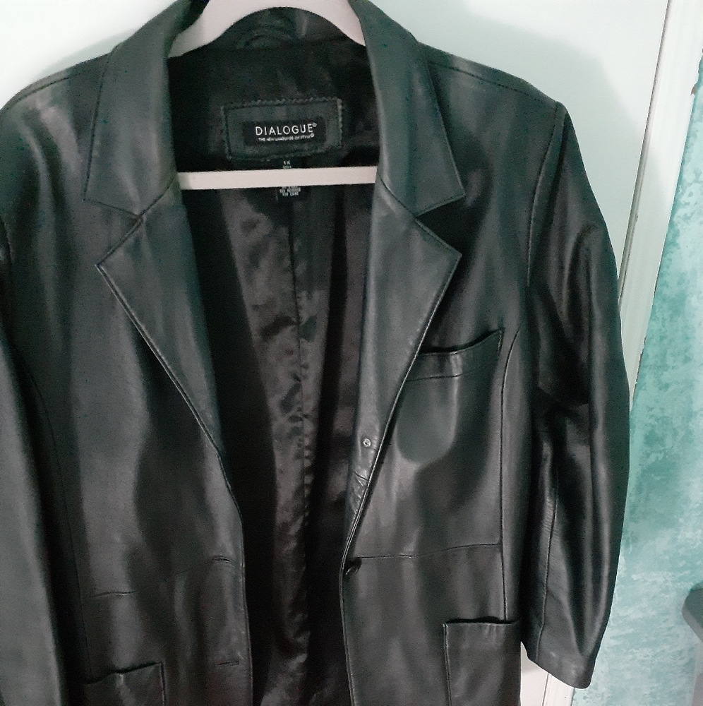 Black leather jacket used lightly worn 3 pockets on jacket some of the buttons are loose and one is missing on the jacket closure
