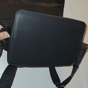 I believe may be vegan leather. Very well made good hardware and stitching.