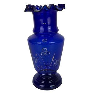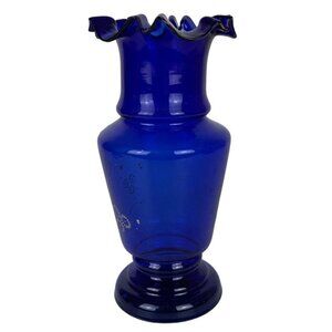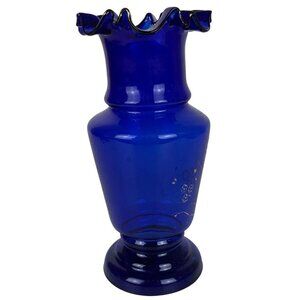 Cobalt Blue Art Glass Vase Hand Painted Flowers Ruffled Edge Vintage