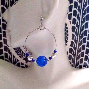 cobalt blue earrings, beaded hoop earrings, heart charm earrings, handmade earrings, statement hoops, retro earrings, colorful jewelry, kitschy cute, Y2K jewelry, flirty fashion, pop princess style, teen girl jewelry