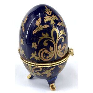 Cobalt Blue Egg Trinket Box Footed Floral Decoration 3.5" Porcelain Vintage