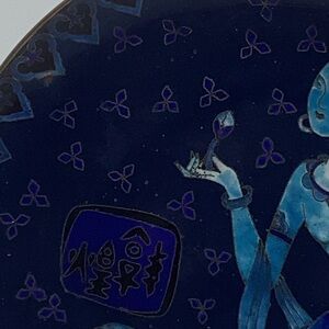 Cobalt Blue Enamelware and Brass 7” shallow bowl featuring an alluring woman in yoga style pose. I am not really sure how to describe it other than exotic. Pre-owned, good condition except for some tarnish on brass rim. The writing on back is illegible.