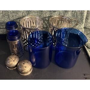 Cobalt Blue Glass Insert Silver Plated Shakers Sugar and Creamer Antique