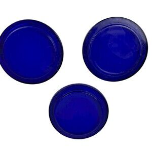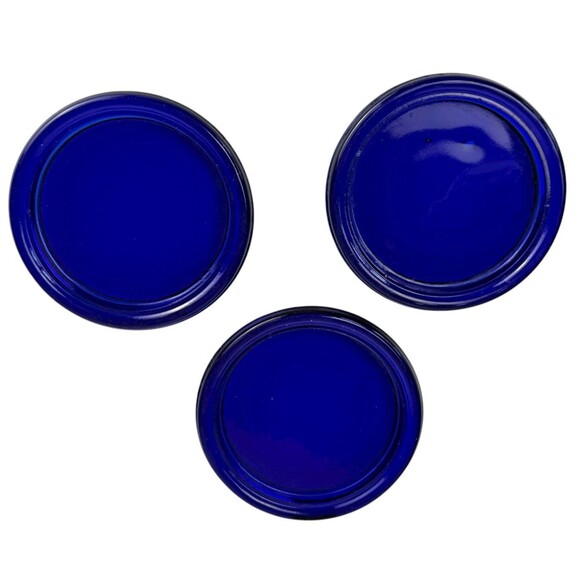 Vintage dark cobalt blue glass coasters. Stackable bold blue round coasters with rim. Solid blue, design free, measuring approximately 4-inch diameter with 3-inch base. No chips or cracks - general use wear. Perfect as designed coasters, trinket or ring holder, or candle base. Mid-century retro style for collectors of cobalt glass, coastal living, and vintage styled homes.