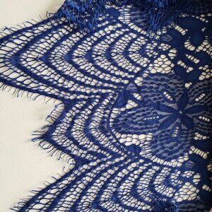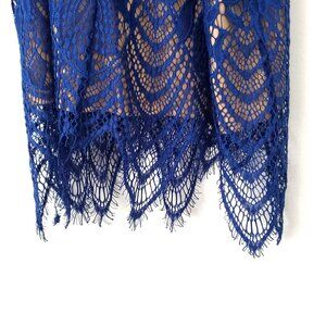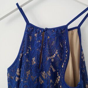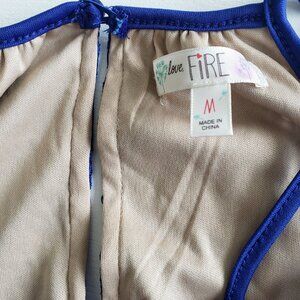 Love Fire cobalt blue lace top, raw, fringed edges. High neck, halter styling but has short nonadjustable spaghetti straps. Fully lined in a dark cream poly lining. Lace listed as 100% nylon. Size is medium, Made in China. Small keyhole closure with blue button on back of top. Seam to seam across chest is about 19 inches. The item is previously owned,