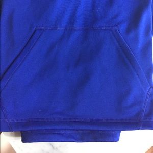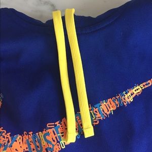 Vibrant and comfy blue Nike sweatshirt! A bit longer - hits me just below my hips, which I think is more flattering. Yellow drawstrings on the hood and a nice pocket on the tummy! Super good condition.