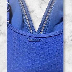 This stunning cobalt blue one-piece swimsuit features a plunging V-neckline and wide shoulder straps for optimal support. The elegant mesh insets along the waistline create a flattering silhouette, while the high-quality fabric ensures a sleek and sophisticated look.