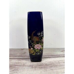 Vintage Cobalt Blue Ceramic Peacock and floral design Vase 9.25" Tall Japan Gold Trim, Tongping/Rolwagen vase.