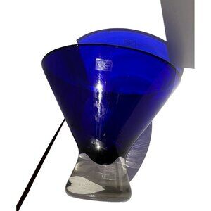 Cobalt blue martini glass handcrafted in Poland, mouthblown. Original sticker still on front of glass. Cobalt glass upper, clear glass stem. About 6" tall, the martini bowl is in cobalt and rests seamlessly into a clear glass base. Substantial piece, heavy and solid.