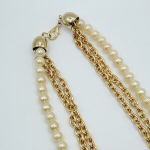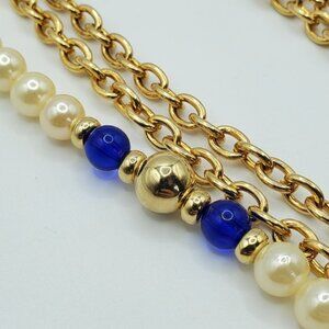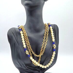 Faux Pearls Cobalt Blue Beads Necklace Multi Strand Gold Tone Chains Jewelry