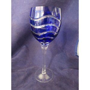 Cobalt Cut to Clear Wavy Lines Crystal Bohemian Wine Glass Unmarked Flawed