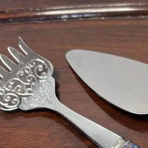 Cobalt blue Enamel Floral Charcuterie Fork & Spatula Sheffield England. Beautiful design.