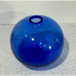 Cobalt blue glass vase - ball shaped with deep color and a small round top opening - a wonderful pop of color in minimalist design. Decorative glass is perfect for your home decor. No tags, labels or other hallmarks on this piece. Smooth base - no apparent damage or flaws. Very eye-catching!