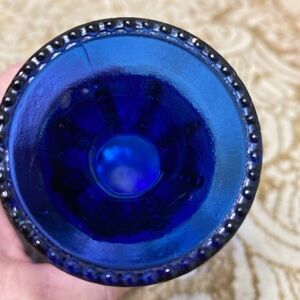 Cobalt blue glass vintage bud vase ribbed edge and hobnail design produced by India glass in the United States features a unique design embody in mid century modern. Standing 5 inches tall one and three-quarter at mouth. Approximately 3 inches in diameter. A stunning piece for any collector this is a number 4 on the bottom. Cambridge, Fenton, Illinois.