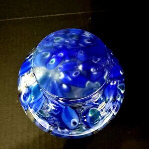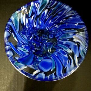 This stunning cobalt blue spotted confetti vase is a hand-blown art piece with a smooth pontil. Its unique design adds a touch of elegance to any room, making it perfect for art collectors and home decorators alike. Comes from a smoke free home.