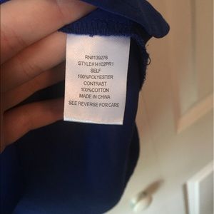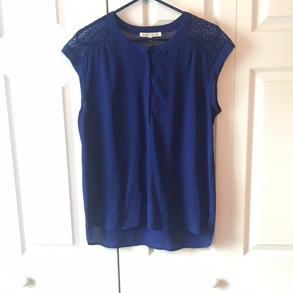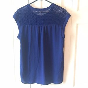 Cute cobalt blue top with fish net like material on shoulders and top of back (shown in pic) shirt only worn maybe twice. very good condition