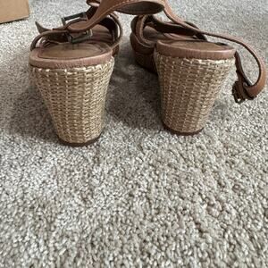 Cobb Hill by New Balance Gladiator Ankle Strap Wedges Sandals in Women's Size 9.5 Light Brown leather, Cage style sandals, adjustable ankle strap, open toe. Shoes are in very good used condition with minor signs of wear. Please see close-up pictures for condition details and heel measurement.