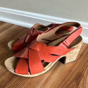 Stylish orange leather mules. Comfortable wedge heel. Perfect for casual outings.