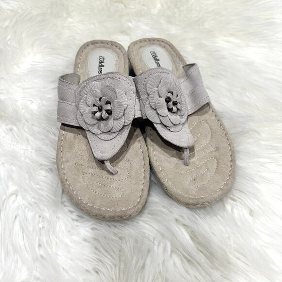 Like New Cobbie Cuddlers Regina Beige Suede Floral Applique Flip Flop Sandal Sz 11W