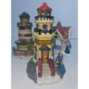 This lot of three CobbleChristmas Village pieces is a charming addition to any holiday decor. The set includes two lighthouses and one gazebo, all made of ceramic and painted in a traditional style. The multicolor buildings are suitable for display on a window sill or any furniture, and are perfect for any room in your home. Approximate Measurements 4X5.