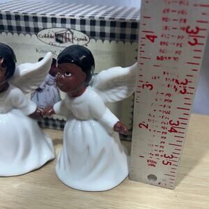 This Cobble Creek figurine set features two adorable African American angels, a boy and a girl, sharing a sweet kiss. These charming angels are new in their original box and ready to bring a touch of love and whimsy to your home decor. The set includes delightful kissing angels and decorative bells. Perfect for collectors or as a heartwarming gift!