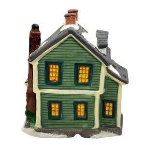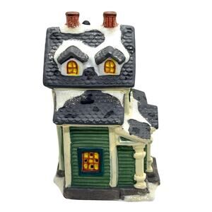 Cobblestone Corners Christmas Village Victorian Two-Story House, released in 2003. This charming ceramic building features classic green siding, holiday wreaths, detailed snowy shingles, and dual chimneys. Designed with an opening on the bottom so it can be lit from within (light not included). Measures approximately 4.5" H x 4" W x 3" D. Made in China. Excellent preowned condition with no damage noted.