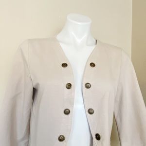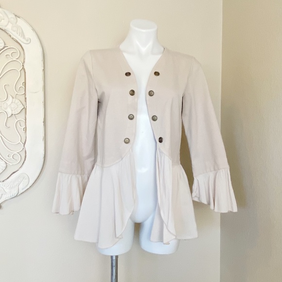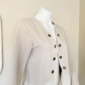 A cream long sleeve open jacket with button detail from Cobblestone. Features mixed media, top is cotton with viscose ruffle bottom and sleeve detail. Front DOES NOT button, buttons are a detail.