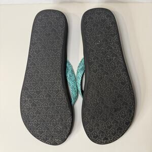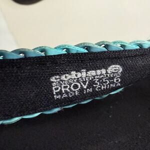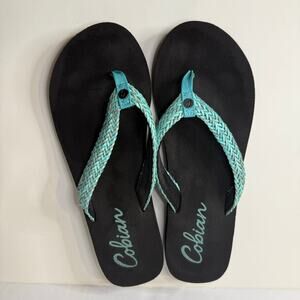 Cobian black flip flops with teal faux leather strap. In good used condition.