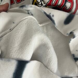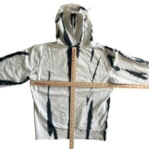 Official Bioworld Cobra Kai hoodie featuring Strike First / Strike Hard / No Mercy graphic. White and black tie-dye pattern with fleece interior. Pullover fit with kangaroo pocket and hood. Size M.