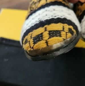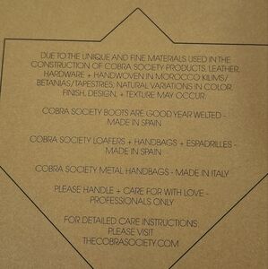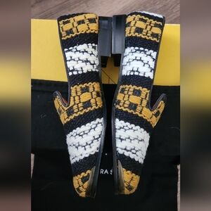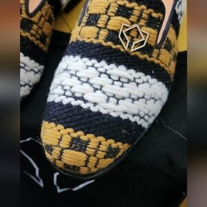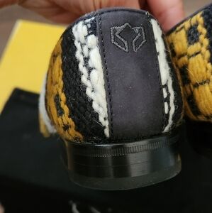 Geometric patterns woven along a pair of Cobra Society smoking slippers, constructed out of wool tapestry and accented with an oxidized metal strip at the toe. Glazed leather piping trims the notched top line. Stacked heel and leather sole. - True to Size - Hand Made in Spain. Productcode COBRAF2-2 Designer COBRA SOCIETY