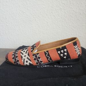 Cobra Society "Najet" loafers/smoking slippers. Gorgeous hand-woven Moroccan kilim textile with orange/black/cream/pink geometric pattern. Calf leather trim and genuine leather soles. Metal tip on toe to prevent damage to the textile. Made in Spain with amazing artisan quality! New condition without box, only includes dust bag. Runs small, with narrow feet, a true size 6 will fit fine, otherwise best for 5.5.