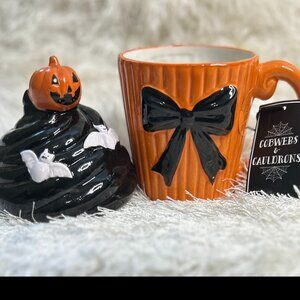 Cobwebbs & Cauldrons Spooky Cupcake Mug with a Bow, Pumpkin & Bats