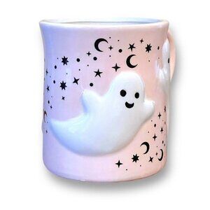 Pink ceramic mug with white and black friendly ghosts, moons and stars