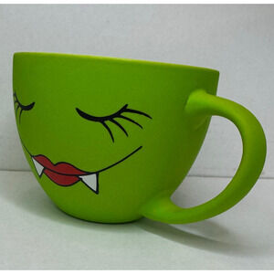 • Bright green ceramic mug with fun vampire face design – lashes, lips & fangs