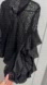 Elegant and dramatic black lace blouse by CobyCo, size Small. Features sheer crochet lace body with a satin tie-neck detail and voluminous layered satin ruffle sleeves for a bold statement look. Made from 100% polyester. The blouse is sheer (best worn with a bralette or cami underneath).